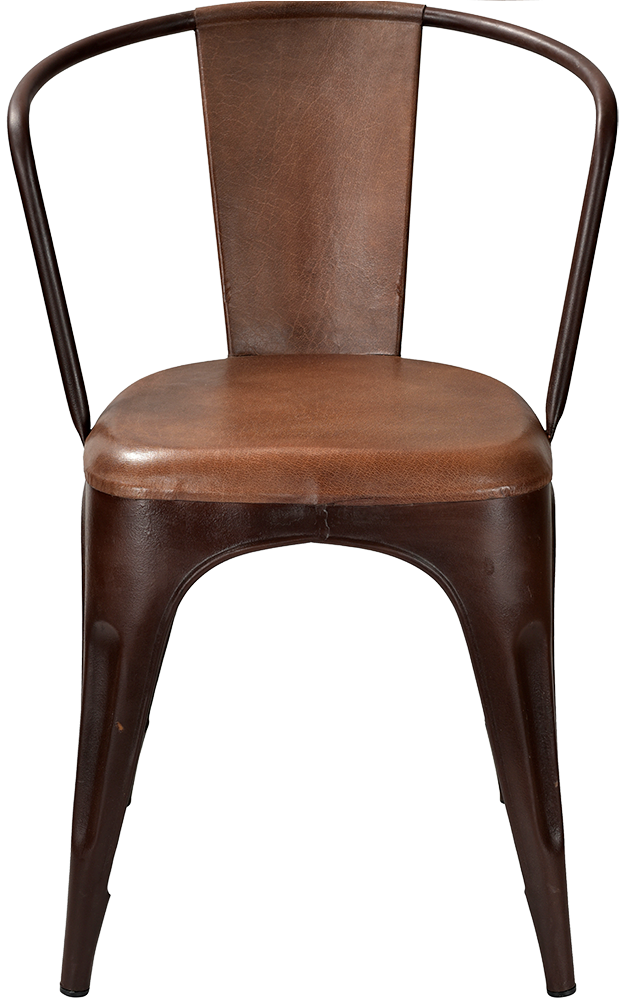 Fräck och robust stol i metall / läder med en vintage stil. Stolen kan staplas när den inte används för att lättare kunna förvaras.