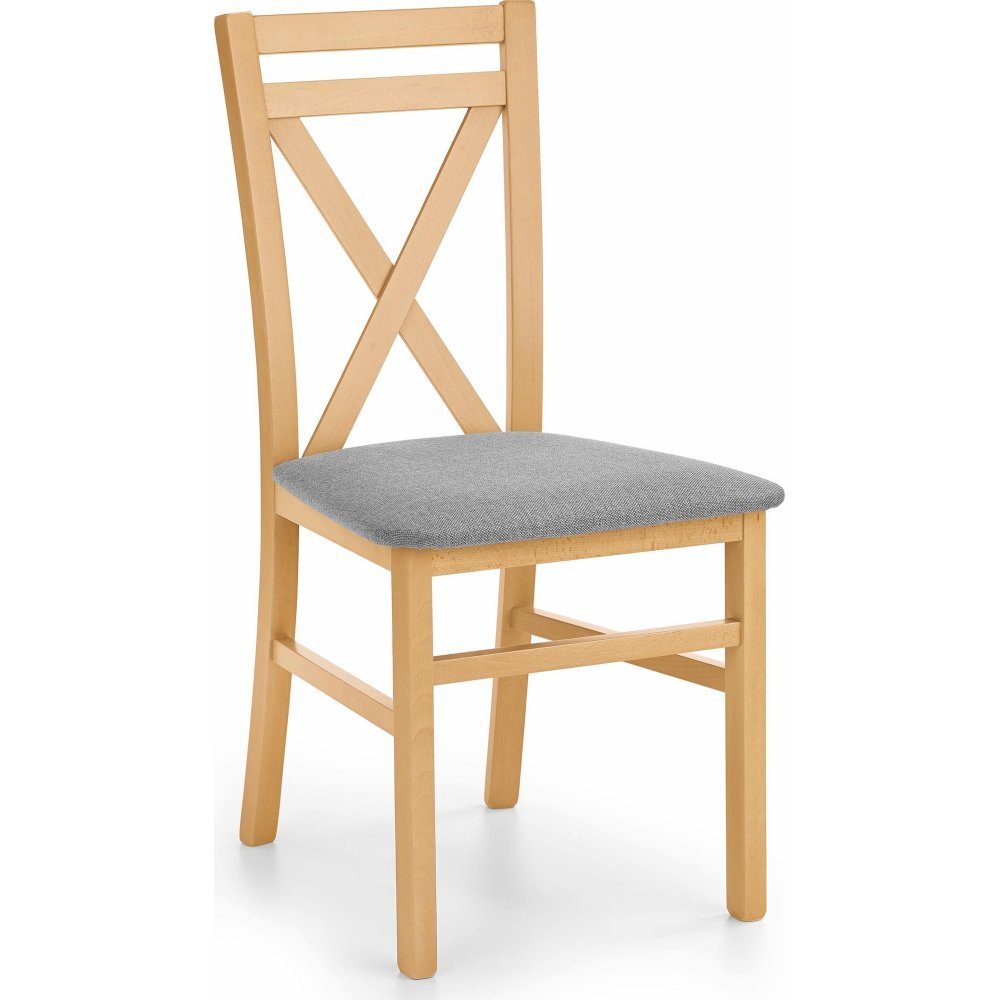 Denna tidlösa matstol kombinerar enkel design med funktionalitet och komfort. Stolen har en robust träram i en ljus träfinish och ett dekorativt X-mönster på ryggstödet, vilket ger den ett klassiskt och elegant uttryck. Den vadderade sitsen är klädd i ett grått tyg som erbjuder både komfort och en modern touch.