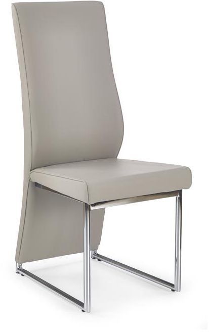 En härlig matstol med en modern design. Underredet är tillverkat i kromad metall och sitsen är klädd med ett mycket behagligt beigt konstläder för maximal komfort.