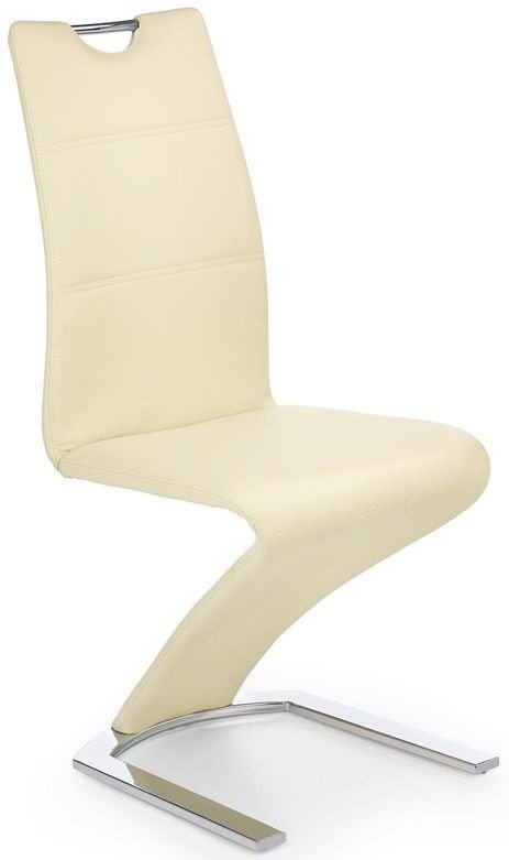 En snygg matstol med en modern design. Stolen är tillverkad i metall med en fot i kromad metall och en mycket behaglig klädsel i krämvitt konstläder för maximal komfort.