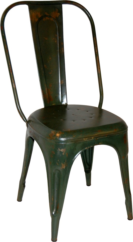 Fräck och robust stol i grön metall med en vintage stil. Stolen kan staplas när den inte används för att lättare kunna förvaras.