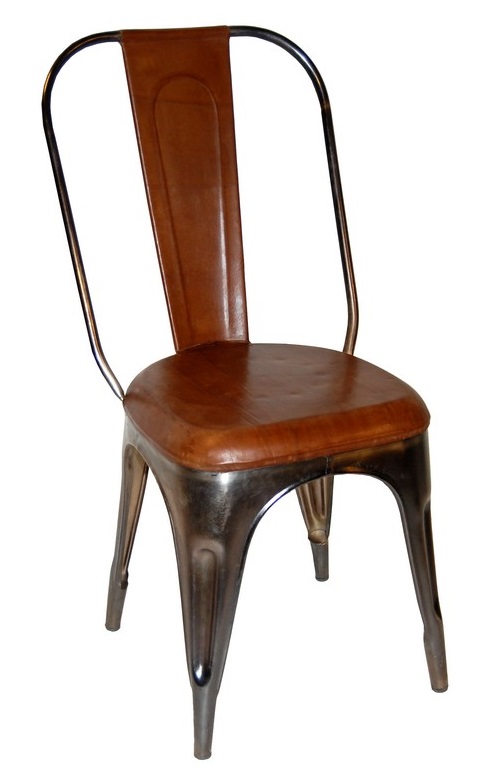 Fräck och robust stol i metall / läder med en vintage stil. Stolen kan staplas när den inte används för att lättare kunna förvaras.