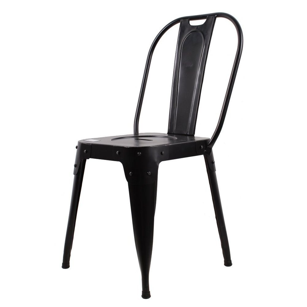 Karismatisk, elegant och njutbar. Den här plåtstolen i svart är något lite extra. Lägg märke till dem nitade huvudena som prydsamt dekorerar stolen och ger den ett utseende som utmärker sig från mängden. Kompleteras fördelaktigt med dyna.