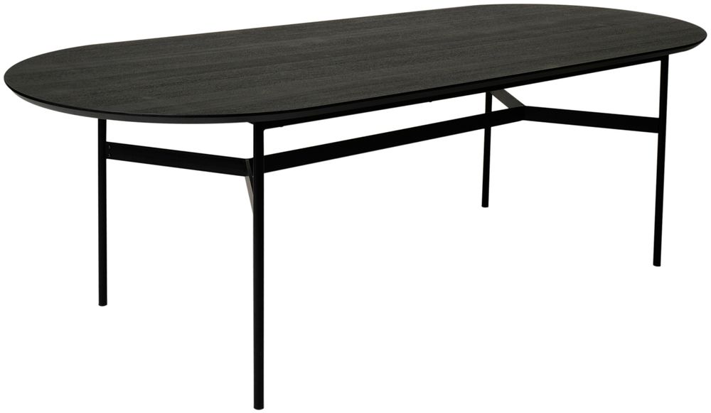 Stort matbord med toppskiva av svart askfanér och ben av svart metall.