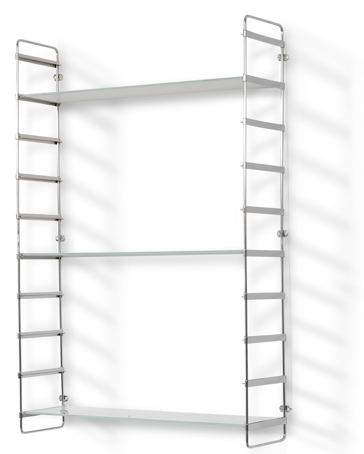 Fräckt designad vägghylla med praktiska justerbara hyllplan. Tillverkad i kromad metall och lätt att montera på plats. Perfekt för förvaring av de diverse saker, exempelvis prydnader, inredning, accessoarer m.m.
