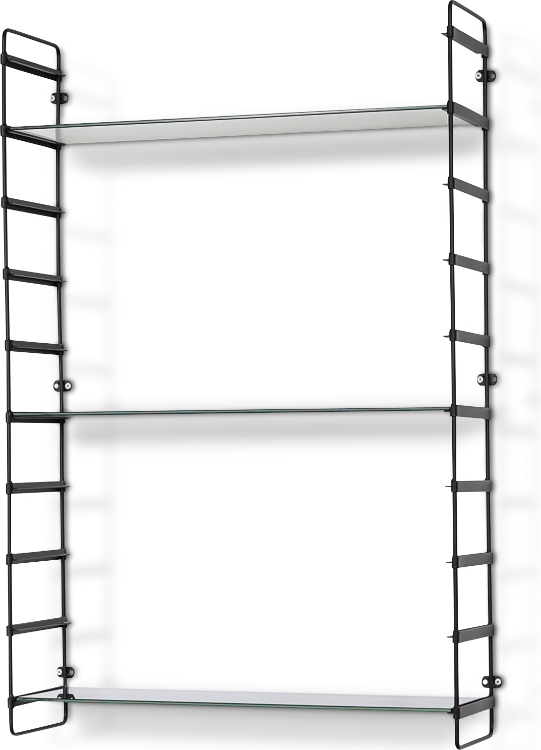 Fräckt designad vägghylla med praktiska justerbara hyllplan. Tillverkad i svart pulverlackad metall och lätt att montera på plats. Perfekt för förvaring av de diverse saker, exempelvis prydnader, inredning, accessoarer m.m.