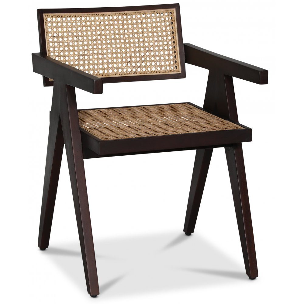 Karmstol med stomme av exklsuiv mahogny i brunt, ryggstöd- och sits av naturfärgad rotting.