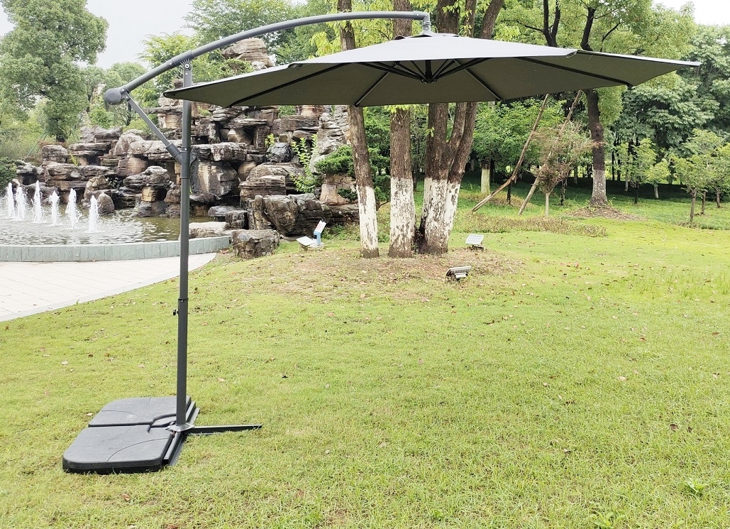 Sunny parasoll ställbar vinkel på parasolltaket. Robust konstruktion med en stor Ø300 cm parasoll. Kryssfoten skruvas antingen fast i ett trädäck eller står fritt. Vi rekomenderar vikter till parasollfoten vid blåst. Parasollen vevas upp smidigt med handvev.