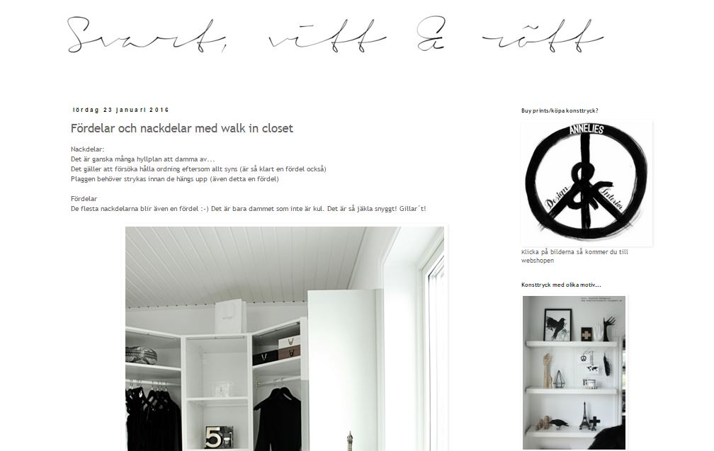 Bildläraren Annelie har skapat en blogg med namnet Svart, vitt & rött. Vi får ta del av massor av inredningstips och många vackra stilleben. Stilrent, minimalistiskt och nästan strikt vitt & svart men med några inslag av naturfärger, var finns det röda? Jo i garderoben och i bland i konsttrycken som Annelie också skapar och säljer. Inredningen är mycket vacker och genomtänkt. Finns det utrymme för påskpynt? Jadå ett påskris men pyntet är vitt är man minimalist så är man. Alla fotografier är tagna av Annelie eller någon i hennes familj och också i dem märker man ett tränat öga för bild.