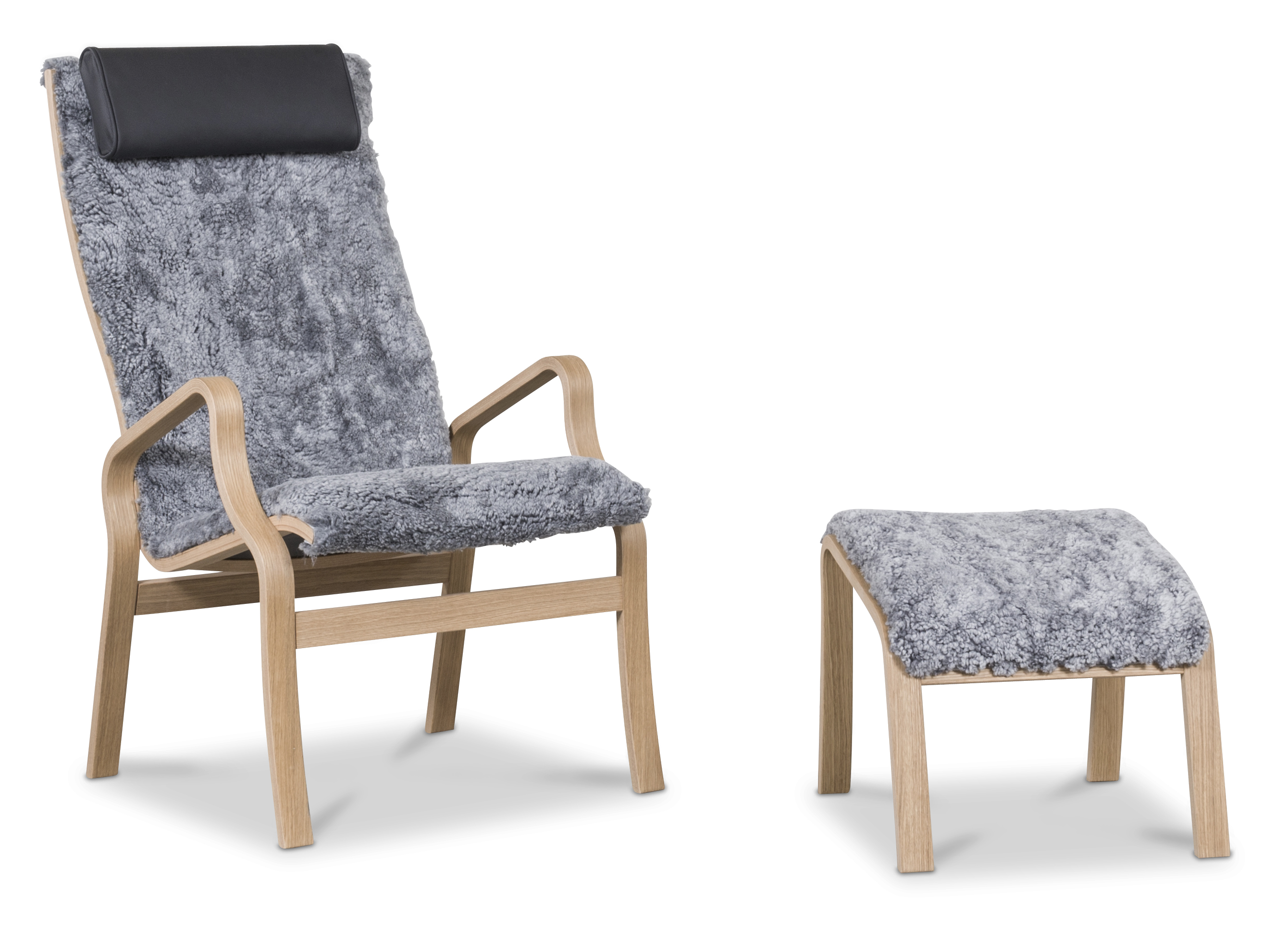 Svea fåtölj med fotpall - Grått fårskinn / oljad ek
