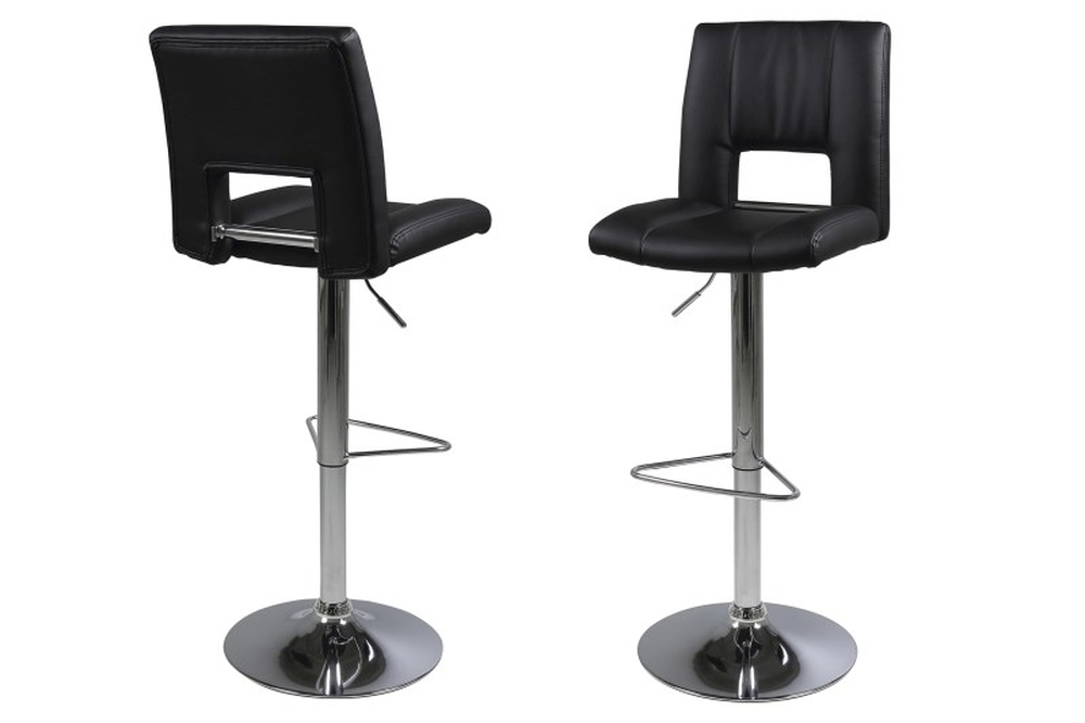 Stilig barstol med en modern design. Klädd med svart konstläder (PU) och trumpetfoten är gjord av kromad metall och är även rustad med fotstöd. Sitsens höjd är reglerbar tack vare den TÜV märkta gasfjädringen. Stolen ingår i vår Sylvia serie.