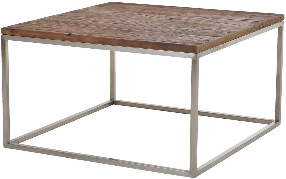Sätt en vintage-look på din inredning med det här soffbordet med skiva av antik alm. Underrede i polerat rostfritt stål.