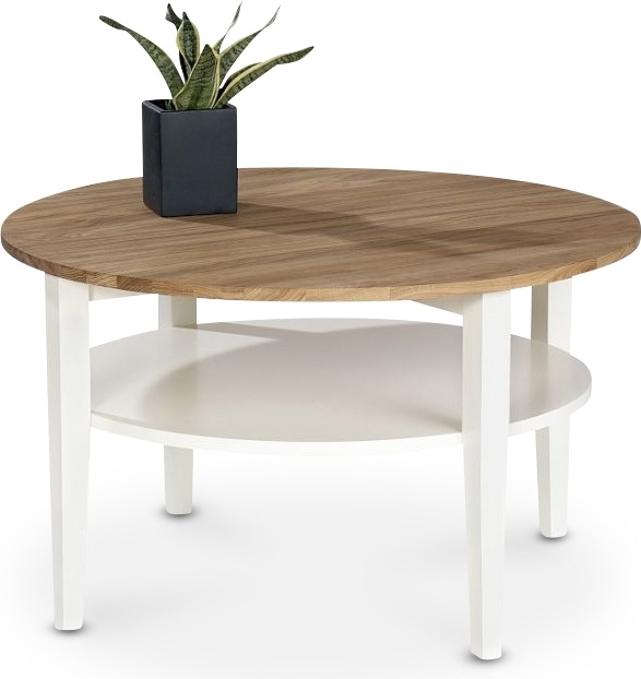 Soffbord från Skånska Möbelhuset med bordsskiva i antikbehandlad massiv oljad ek och vitlackerade ben med underhylla.