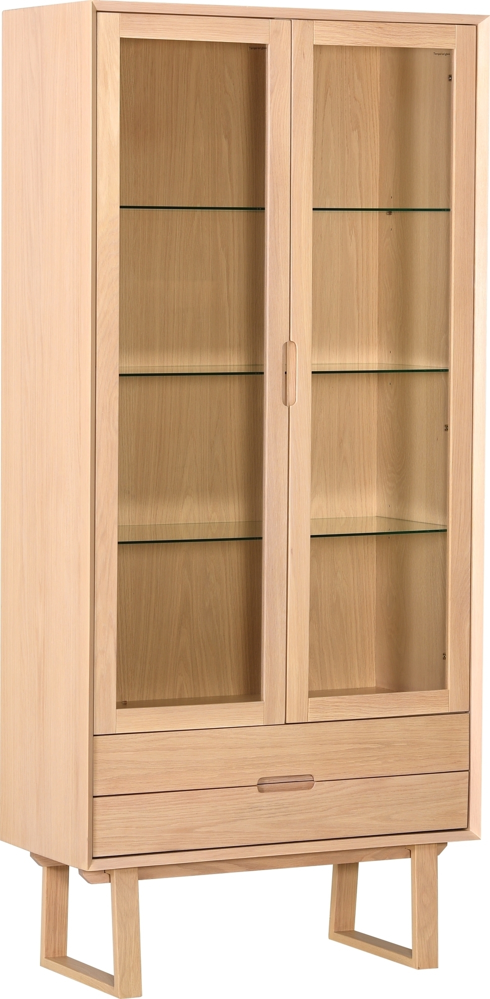 Vitrinskåp i vitpigmenterad lackad ek med soft-close dörrar och LED-upplyst interiör.