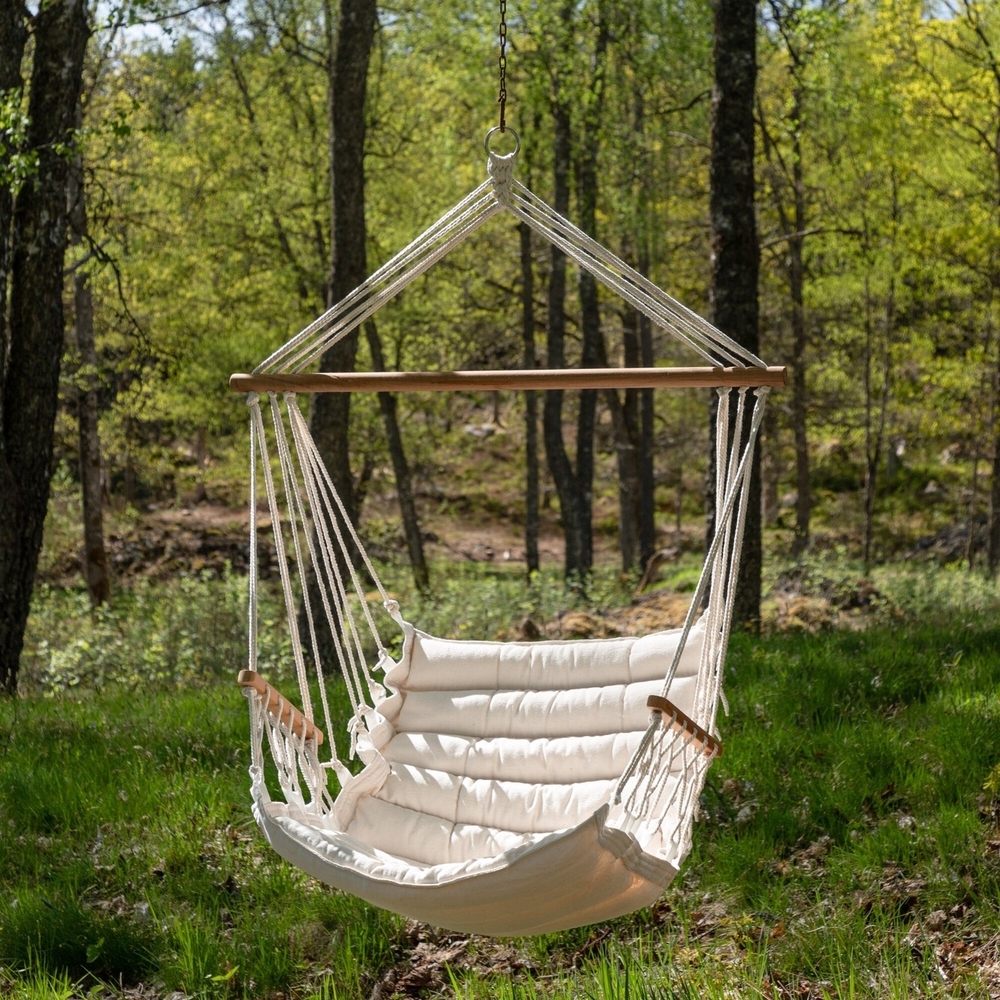 Skapa trädgårdens mysigaste plats med hjälp av en hammock från serien Tapaz! Den här hängstolen har allt: modern utformning, inbjudande design och tåligt material. Sisten är i vitt polyester- och bomullstyg och repen hålls ihop av dekorativa trädetaljer. Hitta din plats för avkoppling och njut av harmonisk och bekväm egentid!