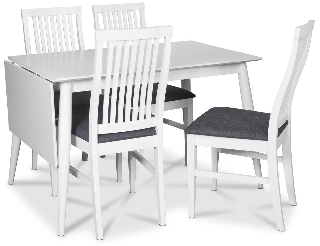 Matgrupp från Skånska Möbelhuset, Tärnö klaffbord 120 cm + klaff 40 cm. Bordet är tillverkat i massivt vitlackat trä. Tärnö ett klassiskt klaffbord med raka linjer. En design som passar i de flesta sammanhang. 4 st vitlackade trästolar med grå tygsits!
