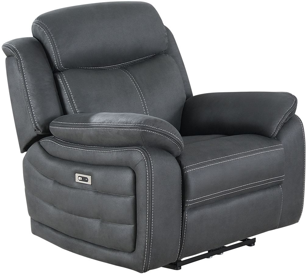 Eldriven reclinerfåtölj i grått polyesterfiber. Inkl strömbrytare. Höjd på armstödet från golv är 65 cm. Höjd på ryggstödet är 65 cm.