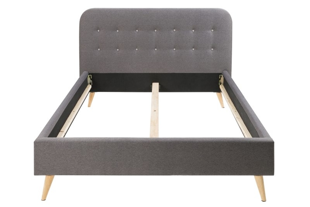 Modern 180 sängram med mörkgrått tyg gavel och ek ben.