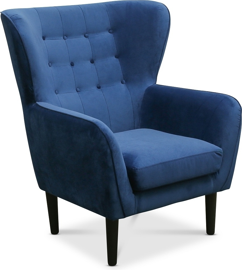 Elegant fåtölj med en klassisk och bekväm design. Fåtöljen är klädd med ett härligt mörkblått sammetstyg och snyggt arbetade träben som är målade svarta. Fåtöljen passar in perfekt i hemmet tillsammans med de flesta inredningsstilarna.