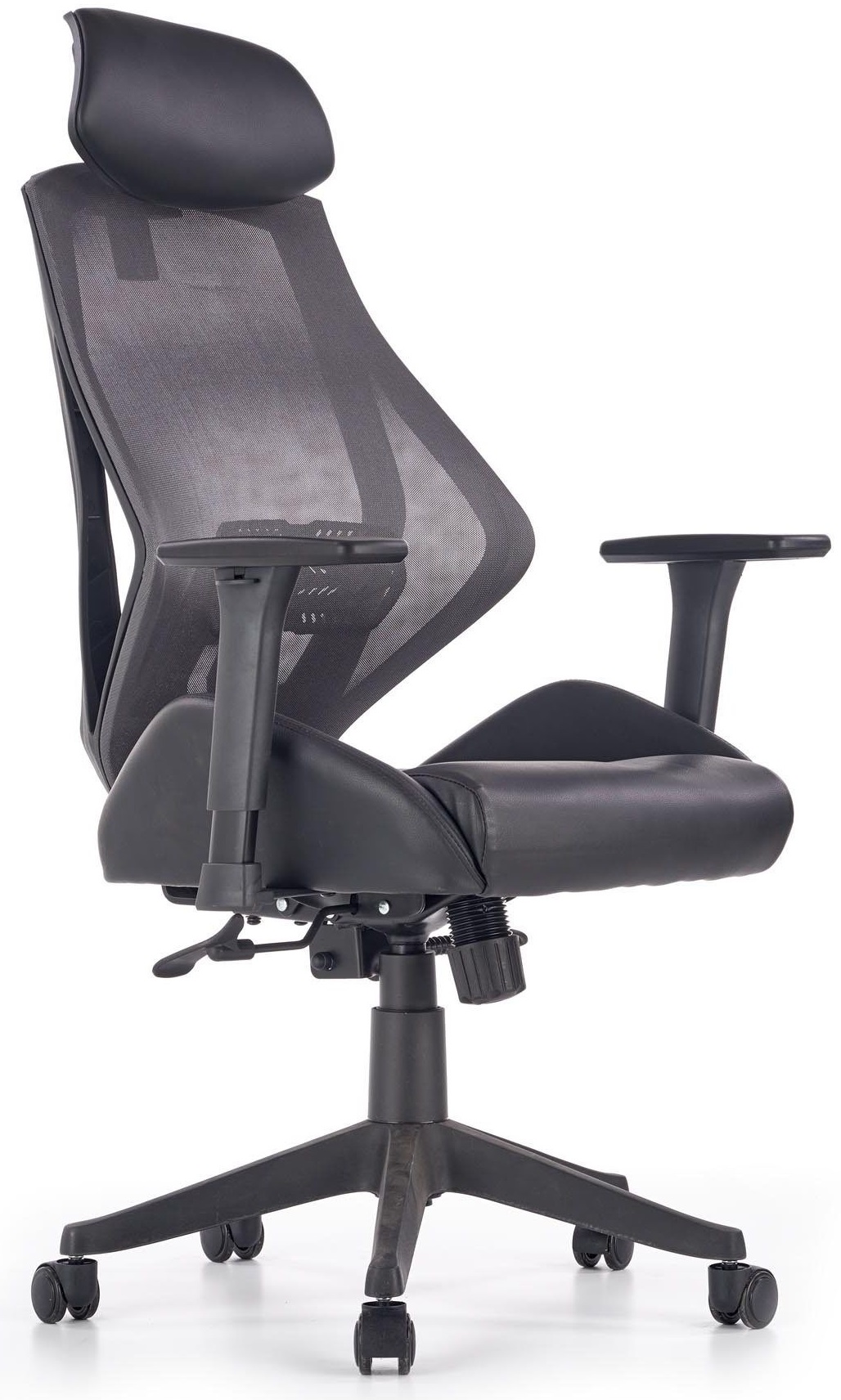 En härlig kontorsstol med en modern design. Kontorsstolen är tillverkad av metall och plast med en mycket behaglig klädsel av konstläder och tyg mesh. Sitsens höjd är lätt justerbar med hjälp av spaken under sitsen, även sitsens lutning, armstöd, ryggstöd och nackstöd är justerbart och stolen är lätt förflyttad tack vare hjulen under stjärnfoten.