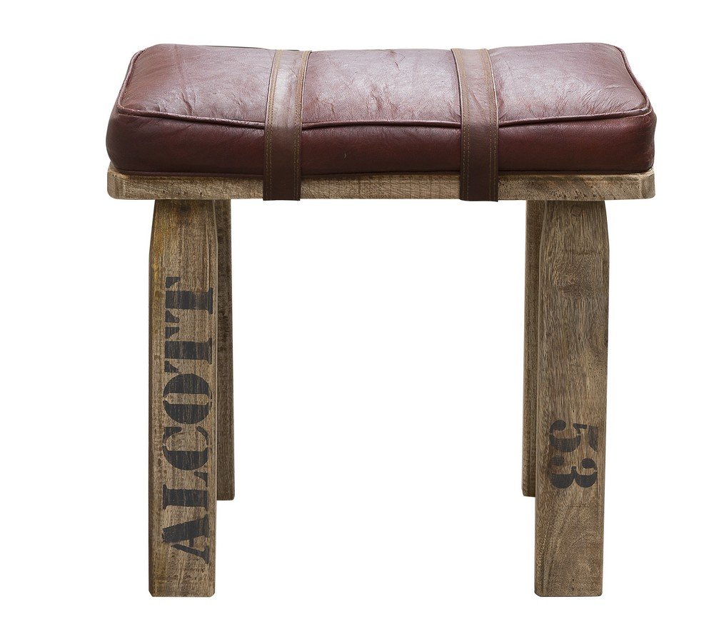 Barstol i vintage med stomme av trä och sits beklädd med brunt läder.