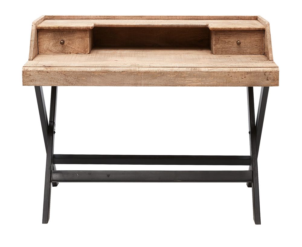 Skrivbord i gammaldags stuk. Överdel i massivt antikbehandlat trä och underrede i svart metall. Förvaringsmöjligheter för pennor och dylikt i de två små lådorna.