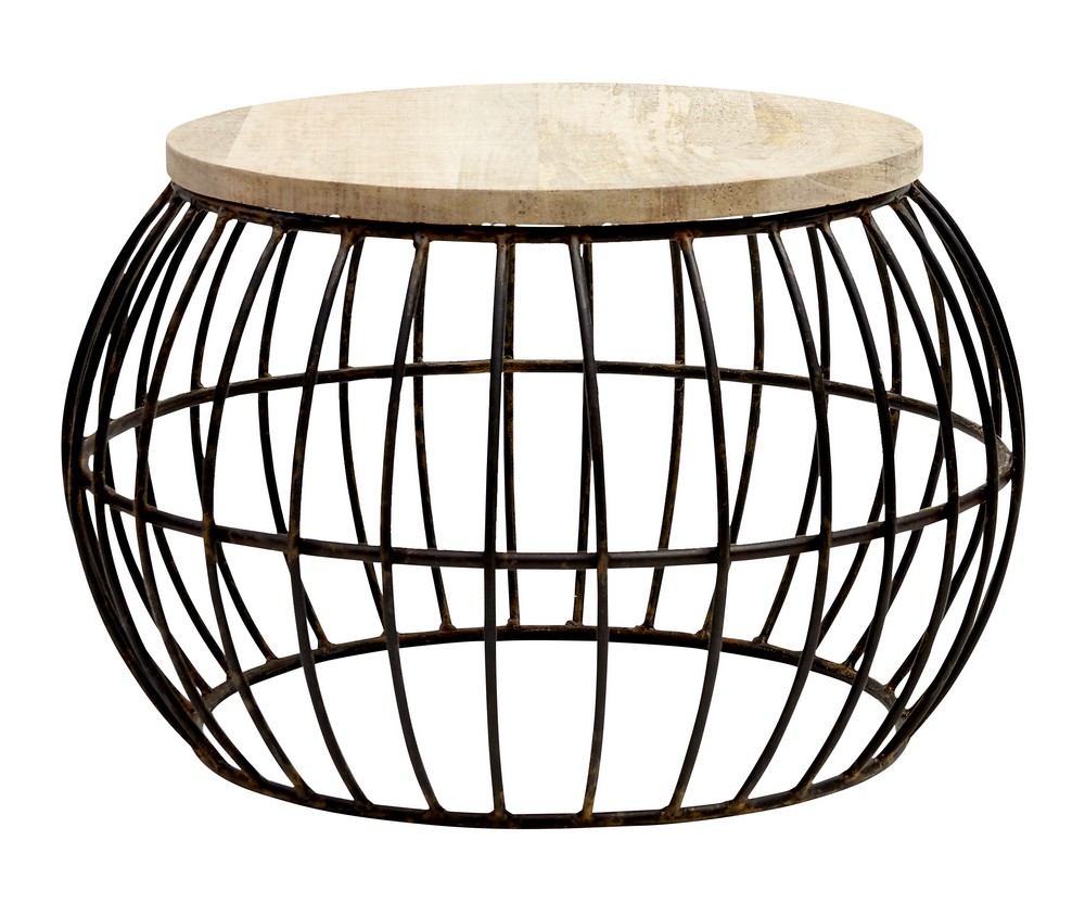 Soffbord med iögonfallande design. Svart ovalt underrede i metall med bordsskiva i ljust trä. Innehåller 2 st bord.