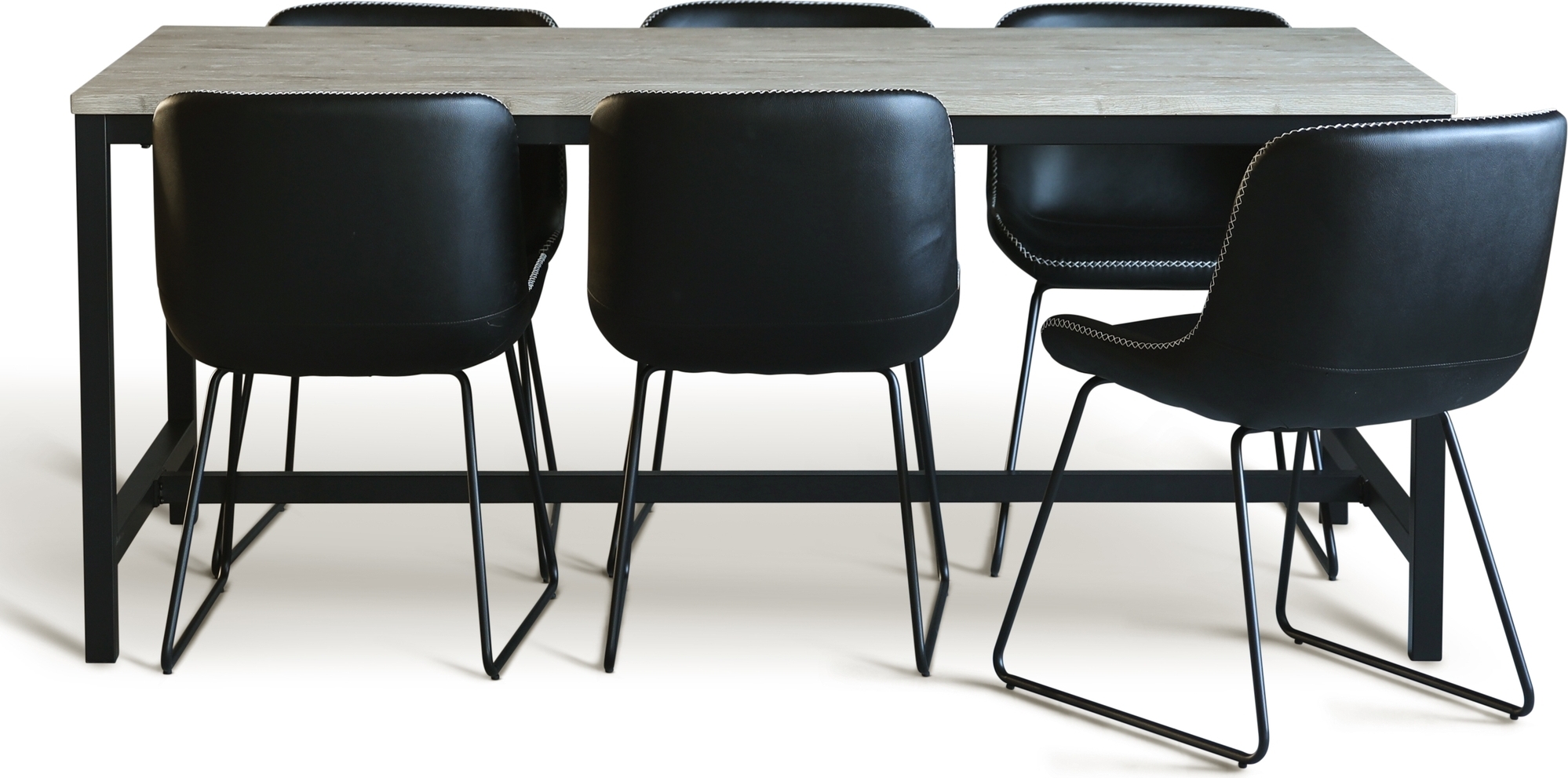 Matgrupp med matbord och 8 st stolar ur serien Texas. Matbordet är gjort av folierad MDF med ben av metall. Stolarna är gjorda av metall med klädsel av konstläder(PU).