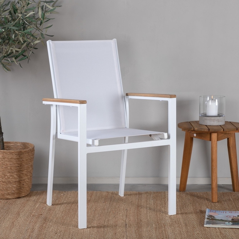 Texas, vår läckra matstol i skandinavisk design! De raka nordiska formerna ger dig en stilren stol som passar till alla tillfälle! Tillverkad i vit aluminium med en sits i textilene. Armstöden är dekorativa i teak vilket skapar en smakfull detalj. Stolen är stapelbar, för smidig förvaring. En slitstark stol som garanterat kommer göra succé på altanen i sommar! Stolen är stapelbar. Skötselråd: Våra möbler i textilene kombineras vanligtvis med teak eller aluminium. Textilene är ett syntetiskt tyg som är tillverkat av PVC-behandlad polyester. Materialet är vattenresistent och UV-behandlat för att motverka solens blekning. Rengöring bör göras ungefär en gång i månaden, använd en fuktig trasa och torka av.