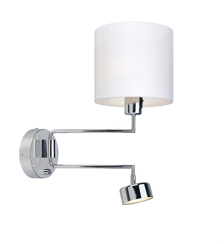 Vägglampa Thelma med en stilren design. Väggfäste i kromad metall med vit textil skärm. Nedre LED ljuskälla dimbar och ställbar. Övre ljuskälla ej dimbar. Strömbytare på lamphuvudet. Bägge armar är ställbara i sidled var för sig. 2 meter transparent sladd. Lampan passar perfekt in på flera platser i hushållet.