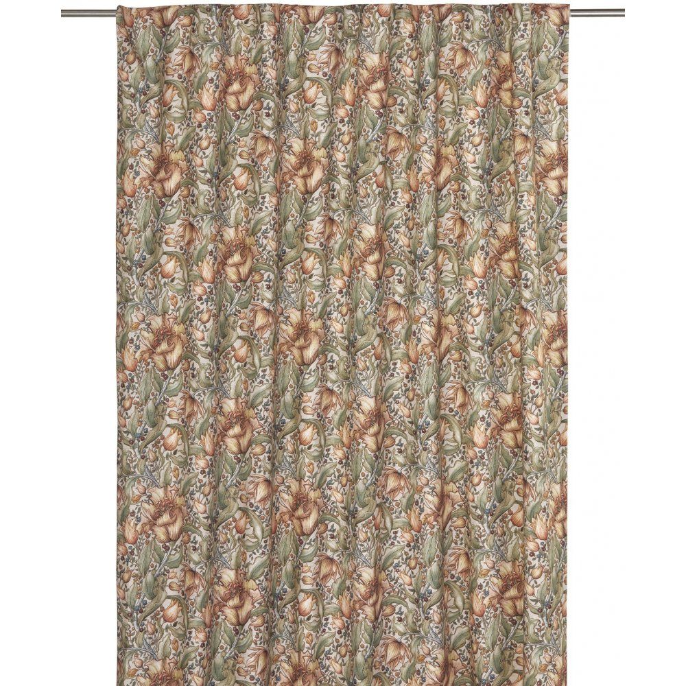 Gardin med tryckt mönster på tyg med inslag av linne. 2-pack multibanlängd med multiband i ovankant, fållade långsidor och overlocksöm i nederkant. Multibandet är en flexibel lösning som gör att gardinen kan hängas upp antingen med fingerkrokar, räkor eller direkt på en stång beroende på vilken typ av veck och vilket fall du vill ha på gardinen. Använd snabbfållningsband för att få önskad längd på gardinen. Måttet är 135x260cm. Kan krympa max 5% på bredden och 1% på längden.