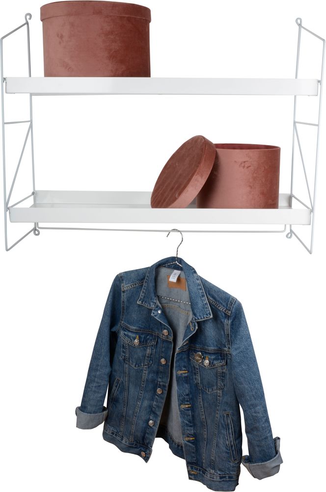 En snygg och modern hatthylla i metall, med två hyllplan och en praktisk klädhängare. Monteras lätt på väggen.