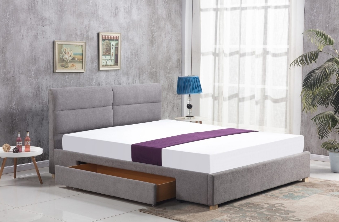 En härlig säng med en modern design. Sängen är tillverkad av solid trä och klädd med ett mycket behagligt tyg. Ramen har även praktiska lådor på sidorna för smart förvaring av exempelvis sängkläder.