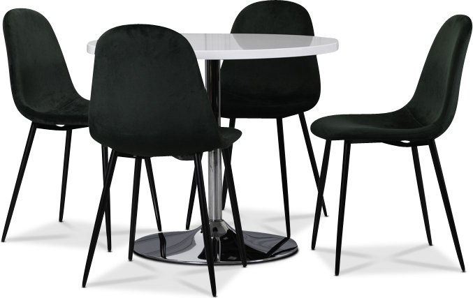 Matgrupp från Skånska Möbelhuset, Tiana matbord 90 cm i diameter med toppskiva i vit högblank. Medföljer 4 st matchande Carisma sammetstolar i grönt sammet med svarta ben.