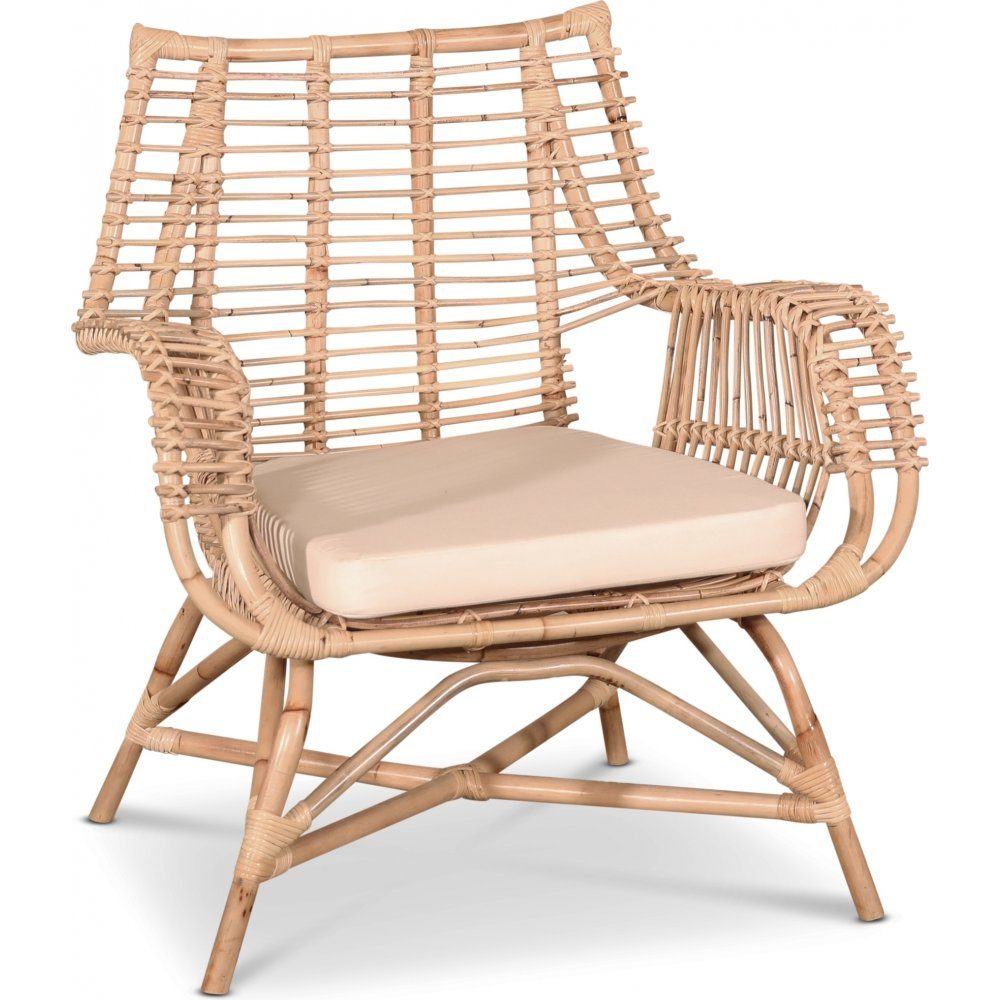 Fåtölj i natur rotting med vit skumstoppad dyna av polyester. Natur rotting bör stå skyddat och är ej lämpligt för utomhusbruk.