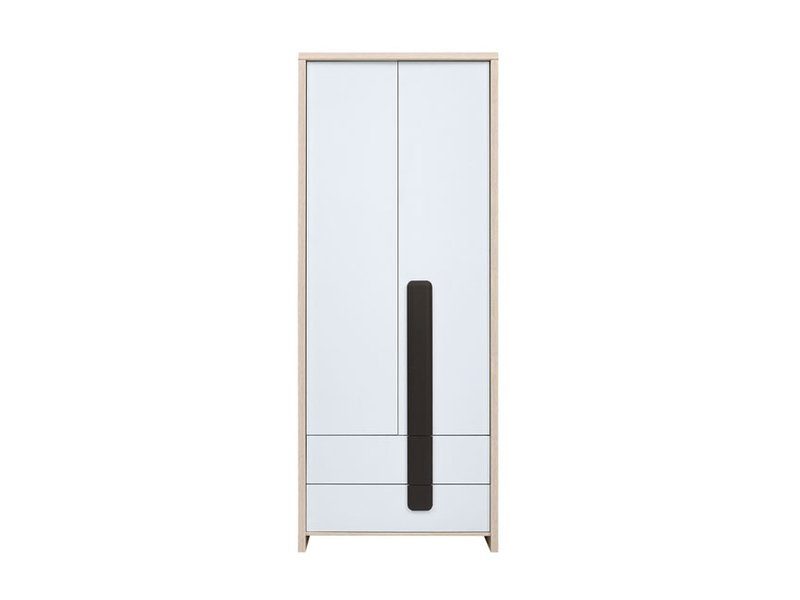 En fin garderob med två dörrar och två lådor undertill. Garderoben är i ek med vita fronter, de svarta detaljerna fungerar som handtag.
