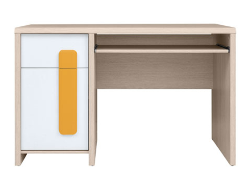 Ett fint skrivbord i ljus ek med vita fronter, på fronterna finns en gul detalj som fungerar som ett handtag. Ett praktiskt utdragbar tangentbordshylla finns så du kan utnyttja skrivbordsytan maximalt. Undertill finns en vågrät skiva som skydda väggen mot smuts men gör även skrivbordet mer stabilt.