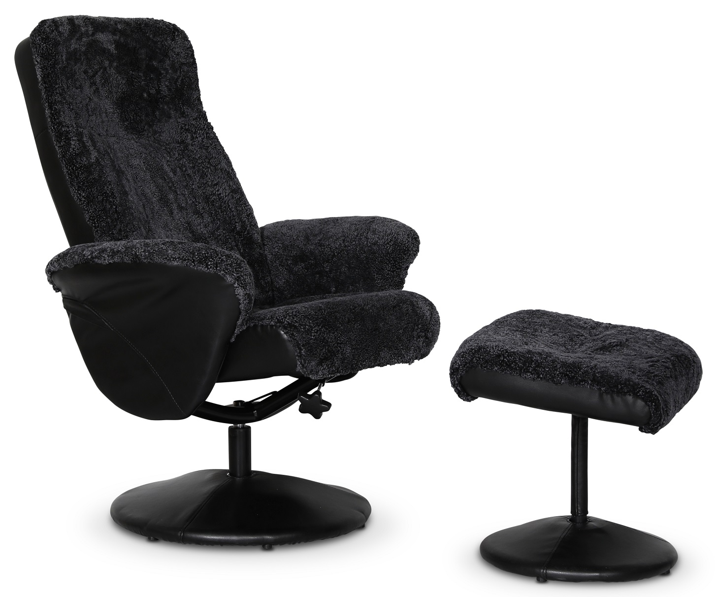 Här i antracitfärgat fårskinn med tåligt svart PU på sidorna och baksidan samt stativet för att återge ett eklusivt utseende och känsla. Recliner funktionen går att ställa och låsa i olika ställningar. Matchande fotpall ingår.