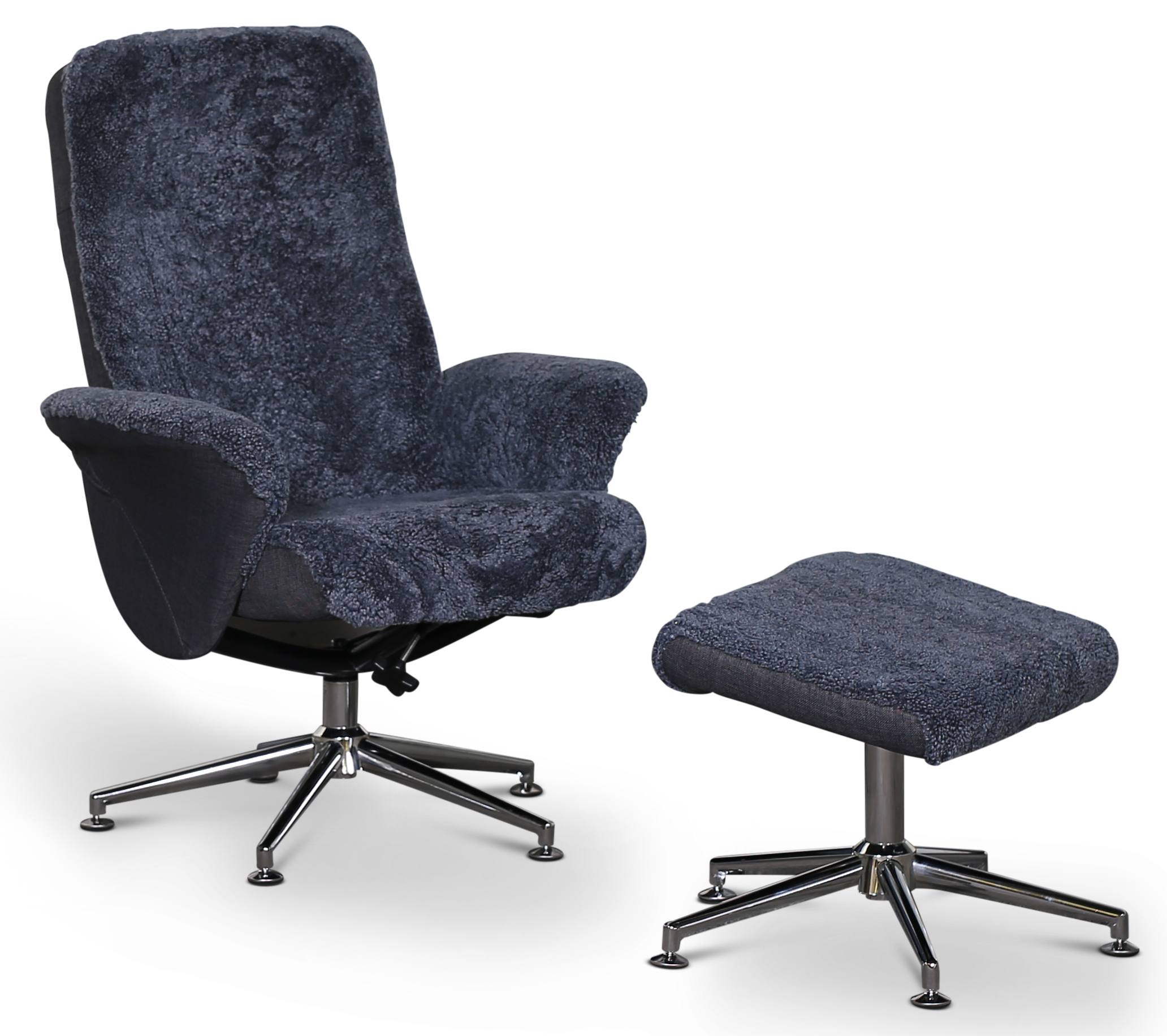 Här i mörkgrått fårskinn med slitstarkt mörkgrått tyg på sidorna och baksidan. Stativet i kromad metall för att återge ett exklusivt utseende och känsla. Recliner funktionen går att ställa in till önskad position och låsa i olika ställningar. Matchande fotpall ingår.