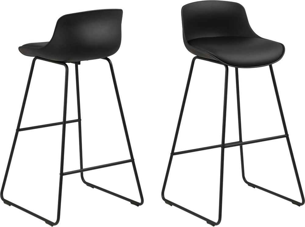 Barstol med underrede tillverkat i svart pulverlackerad metall och sits av svart plast med en sittdyna klädd i svart konstläder.