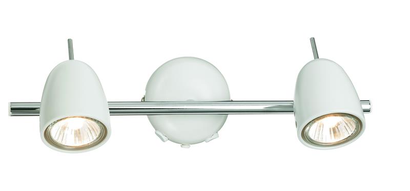 Snygg vägglampa med en stilren design. Tillverkad i vit metall med kromade detaljer. 2 meter sladd med strömbrytare på väggplattan för varje ljuskälla. Max 50W. Lampsockel GU10. Lampan är lättplacerad och passar perfekt in på flera olika platser i hushållet.