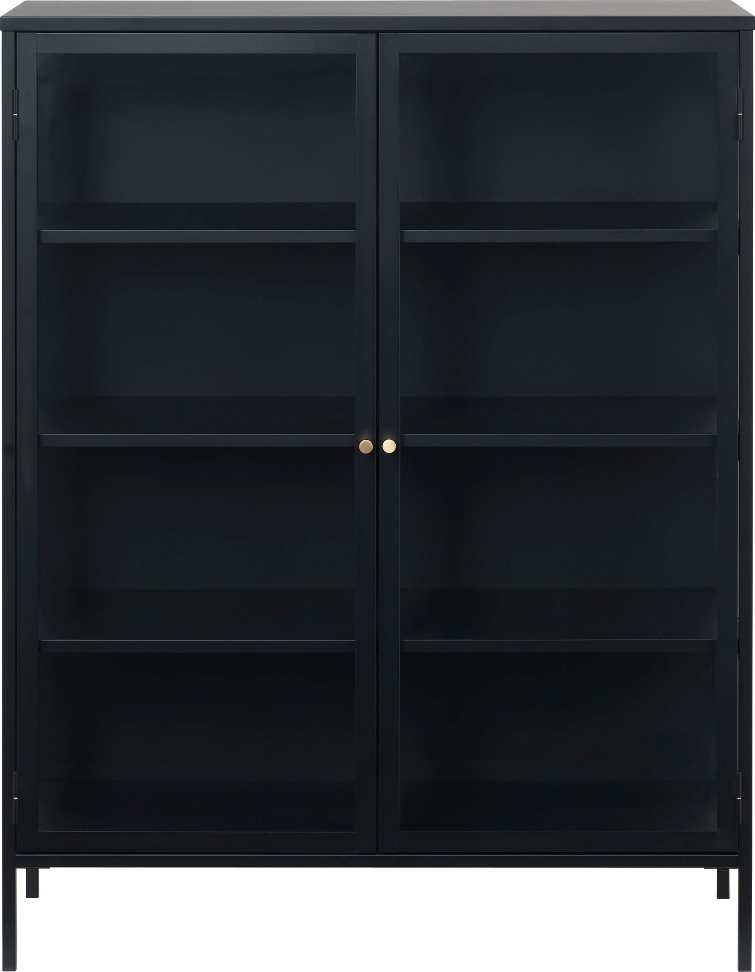 Toddy svart metallskåp med dörrar i klart glas. Handtag i mässing. Skåpet har en stabil konstruktion i metall.