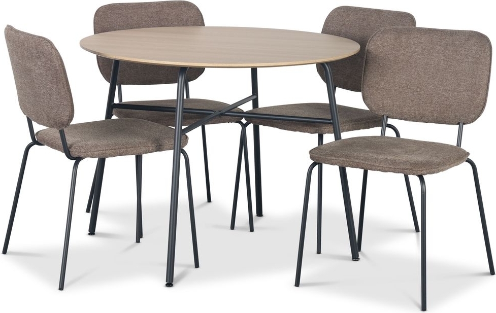 Tofta matgrupp bestående av ett Ø100 cm stort bord med toppskiva av MDF i utförande ljust trä, underrede av svart pulverlackerad metall. Ingår gör också 4 st Lokrume stolar med brun klädsel och svart stomme. En matgrupp i stilren modern design. Fokus på att vara minimalistisk i sitt utförande och färgval som passar bra ihop.