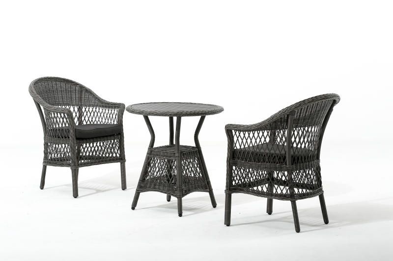 En mysig möbelgrupp med en modern design. Två stolar och ett bord, tillverkade i aluminium och konstrotting, och bordsskivan är av konstträd. Gruppen passar perfekt till uteplatsen eller balkongen och kan vara det lilla extra som behövs för att maxa mysfaktorn.