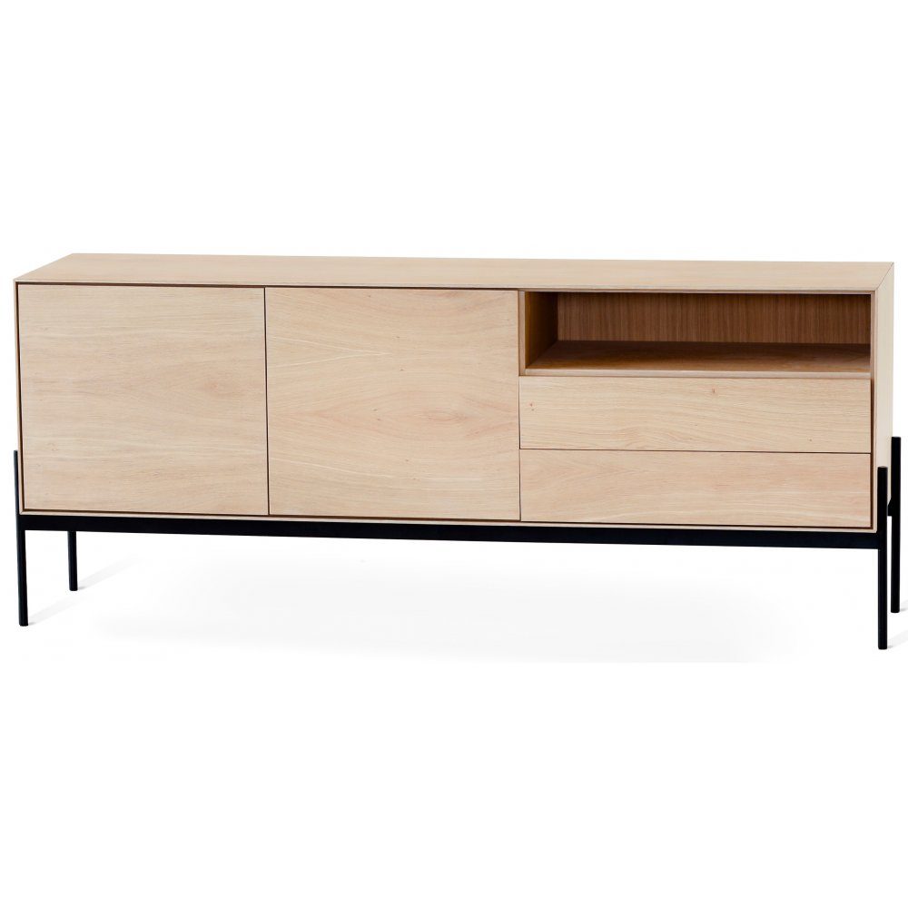 Alè sideboard i vitoljad ek / Fanèr med ett svartlackat metallunderrede. Alè är en möbelserie med buffè, mediabänk, matbord och soffbord.