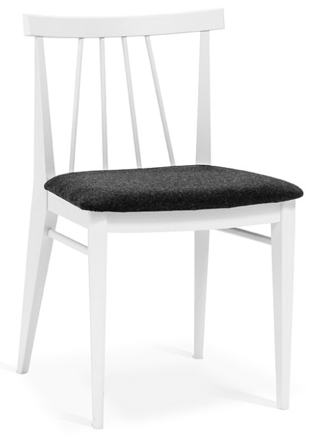 Amy matstol i massiv vitlackad ek med sits i mörgrå ull. Amy är en stolserie i olika utförande.