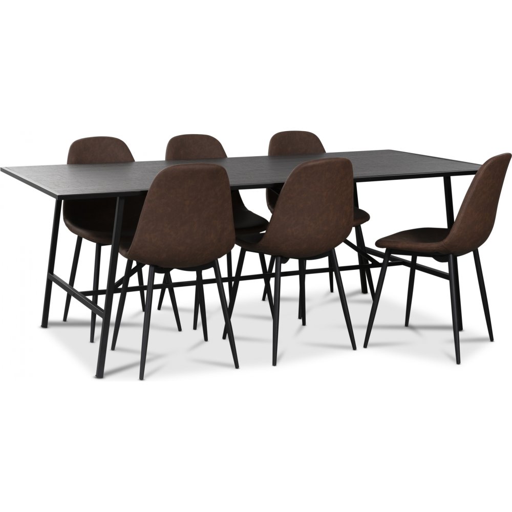 Matgrupp från Skånska Möbelhuset, Toscana 206 cm matbord med toppskiva i brunbetsad ekfoliering och ett matchande svartlackat metallunderrede. Sex stycken Atlantic Empire matstolar i brun tålig PU med svartlackade metallben.