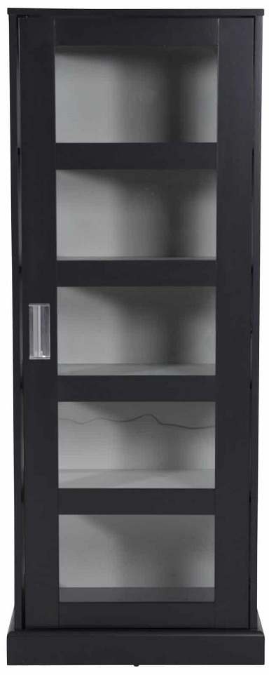 Touch vitrinskåp med vitrindörr. Svartlackad mdf med ljusgrå insida. Fyra praktiska hyllplan för förvaring.