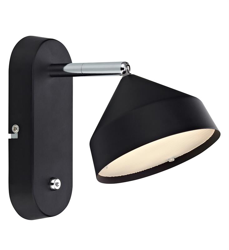 Tratt elegant designade vägglampa. Tillverkad i svartlackerad metall med bländskydd i akryl. Steglös dimmer och strömbrytare i ett. 6W fast LED som ger 540 Lumen. 120° spridningsvinkel. Varmvitt ljus 3000K. Energiklass A. Lampan är lättplacerad och passar perfekt in på flera olika platser i hushållet.