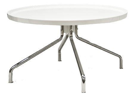 Ett runt soffbord i högblank vitlack med ben i kromad metall.